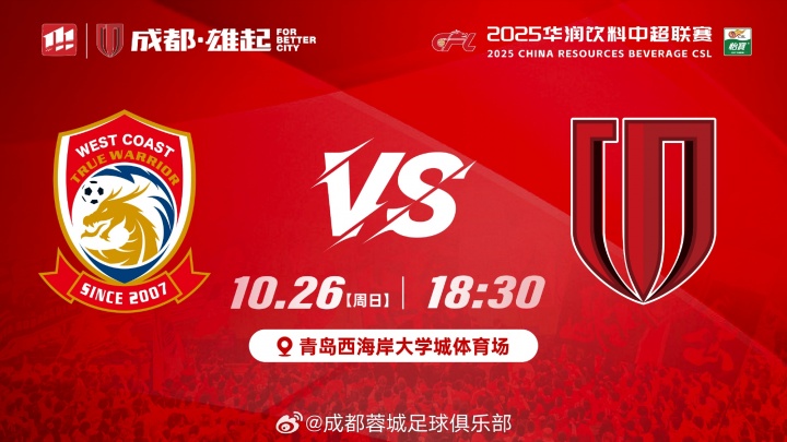 10月26日讯 北京时辰今晚18点30分,中超第28轮,青岛西海岸主场迎战成都蓉城,赛前两边公布首发威望。当今成都蓉城少赛一场过期榜首海港2分,唯有本场比赛取胜,就能登上中超榜首。