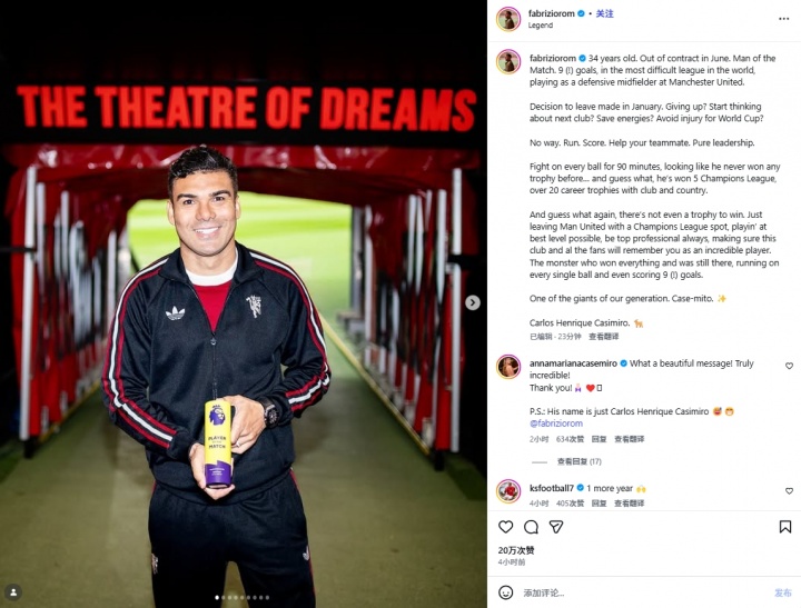 罗马诺发文盛赞卡塞米罗:“34岁、六月合同到期、当选全场最佳。在世界上最艰难的职业联赛 中,在曼联踢防卫 型中场球员,打入9球!