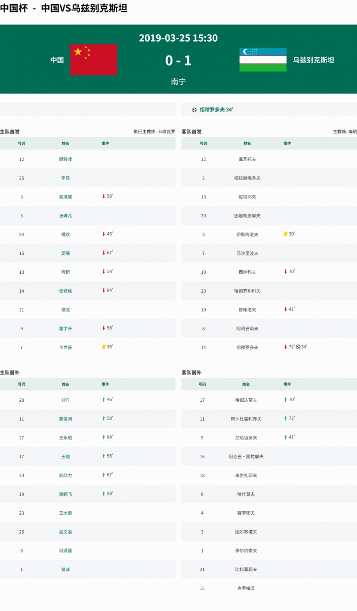 2019年3月25日,第三届中国杯季军争夺战在中国队和乌兹别克斯坦之间进行。上半场国足蹙迫端毫无亮点,绍穆罗多夫爆射破门,韦世豪狰狞飞铲染黄,下半场对方错失屡次良机。最终国足0-1不敌乌兹别克斯坦,当届中国杯两连败且一球未进,排行垫底。