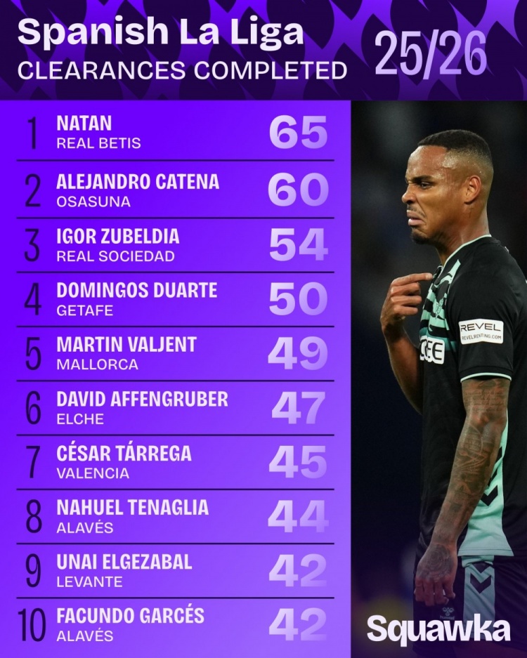 10月7日讯 日前,Squawka统计了本赛季西甲突围次数排名,贝蒂斯后卫纳坦65次居首,祖贝迪亚54轮番三。