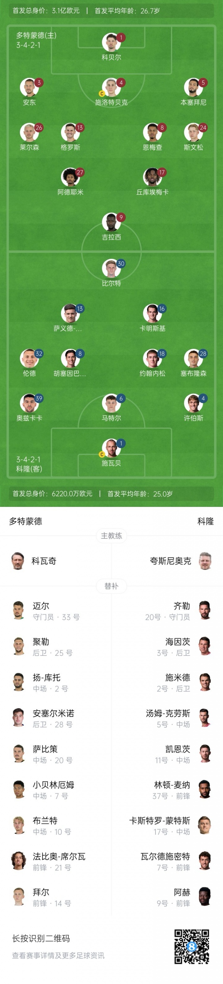 多特首发:1-科贝尔、26-莱尔森、3-安东、4-施洛特贝克、5-本塞拜尼、24-致密松、13-格罗斯、8-恩梅查、27-阿德耶米、17-丘库埃梅卡、9-吉拉西
