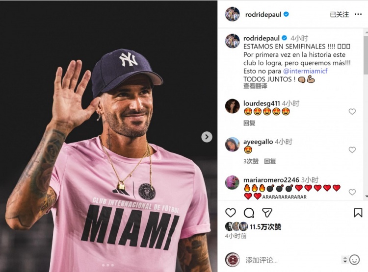 德保罗此役为迈阿密外洋踢满全场,赛后他在酬酢媒体上晒照庆祝晋级,配文:“咱们晋级东区半决赛!俱乐部历史上初次完毕此建设,但咱们志在更远!征途永不啻步,迈阿密外洋众志成城!”