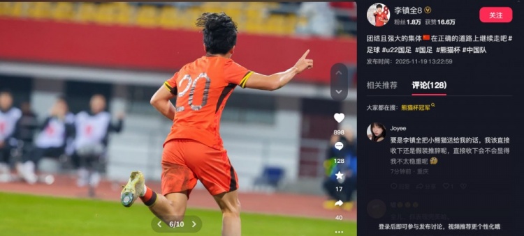 2025年熊猫杯落下帷幕,U22国足1胜1平1负取得亚军,李镇全推崇不俗,他在对阵韩国时打入一球但被吹无效。