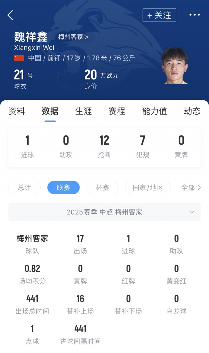 2025年是魏祥鑫工作生存的冲破之年。3月,他在未满17岁时即完成中超首秀;4月客场对阵浙江队的比赛中,他罚入我方创造的点球,以17岁零42天成为中超历史上第四年青的进球者,亦然2008年齿段首位在中超破门的球员。本赛季,他共代表球队出战17场中超联赛,安稳成长为球队的中枢轮流球员。