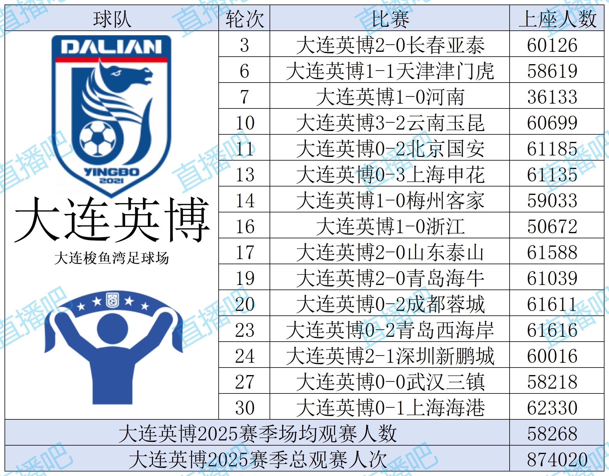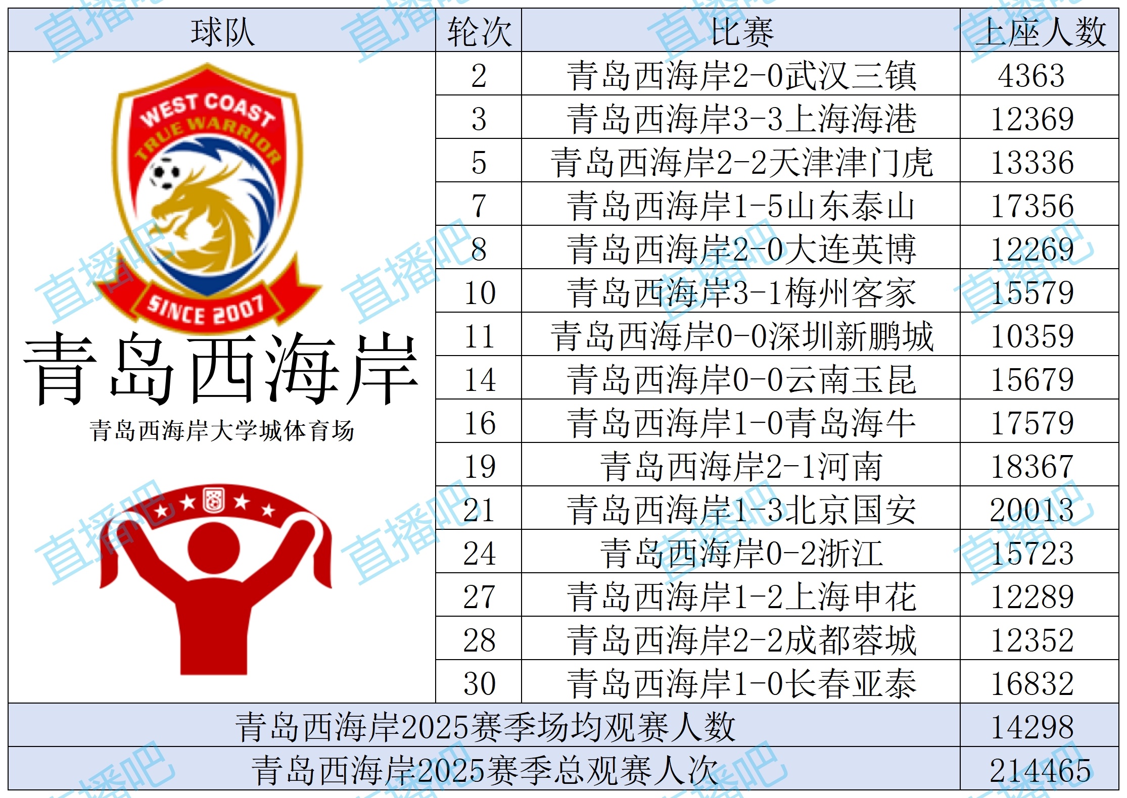 青岛西海岸2025赛季不雅赛东谈主数统计