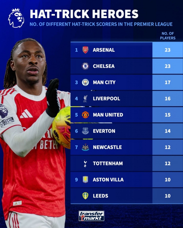 11月24日讯 德国转会市集统计了各队在英超比赛中戴帽的球员数目,并排出榜单,阿森纳、切尔西23东谈主居首,曼城17东谈主第三。