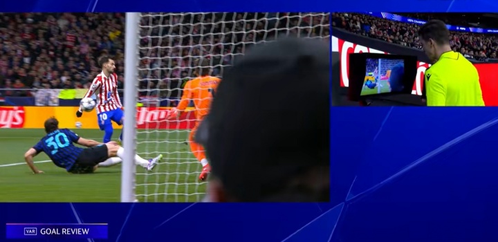 在此次弹珠台般的聚首反弹中,阿尔瓦雷斯得球后超越门将索默将球打进。主裁判勒欧好意思耶当即判罚进球无效,明确指出他合计马竞球员存在违法触球从而影响了迫切发展。但比赛并未立即还原,VAR裁核查捏续了数分钟,随后主裁判到场边查抄回放。