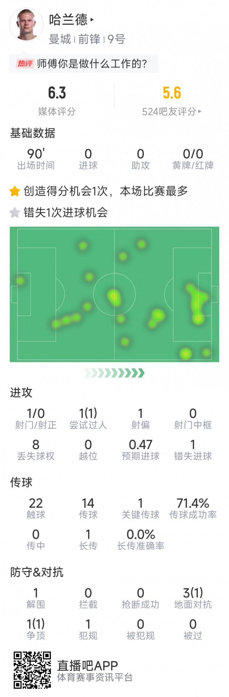 8月23日讯 在本轮英超,曼城0-2不敌热刺。本场比赛哈兰德首发出战,证实契机未几,以下为他在本场数据:
