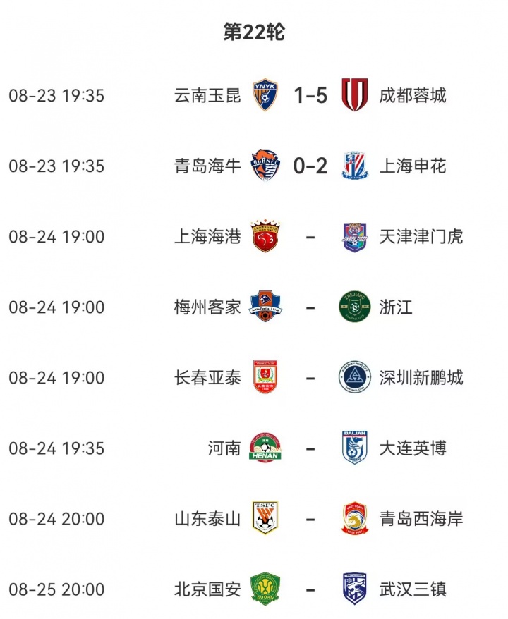 08月23日讯 中超第22轮的前两场比赛为止,蓉城5-1客胜玉昆,申花2-0客胜海牛。