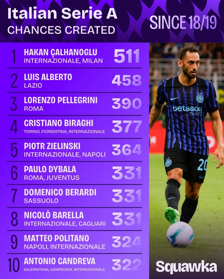 9月7日讯 《转会商场》统计了18-19赛季以来的意甲创造契机情况,恰尔汗奥卢独自领跑。