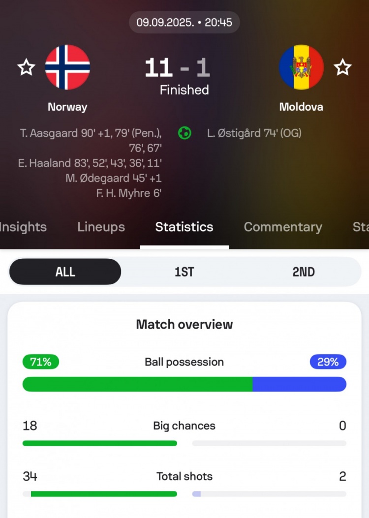 9月10日讯 挪威在本轮世初赛11-1血洗摩尔多瓦,sofascore数据统计露出挪威本场谋略射门34次、创造要紧进球契机18次。