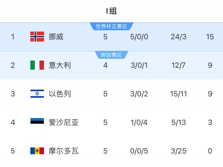 09月10日讯 本次海外比赛日浪漫,世初赛欧洲区I组第6轮,挪威11-1狂胜摩尔多瓦,积15分领跑。