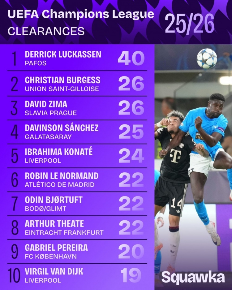 10月23日讯 本赛季欧冠联赛阶段已战罢3轮,Squawka统计了到当今限度的突围榜单。帕福斯后卫卢卡森40次突围断崖式高出,圣吉罗斯后卫布尔格斯和布拉格斯拉维亚后卫王人玛26次分列二三位。