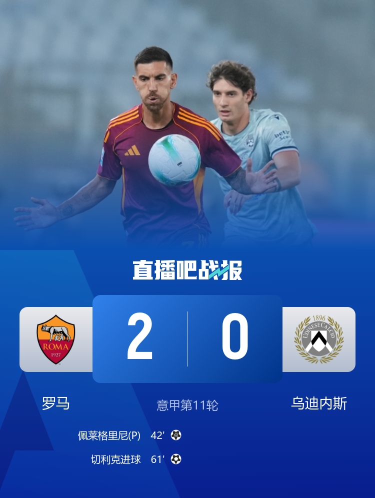 意甲第11轮,罗马2-0校服乌迪内斯,佩莱格里尼、切利克进球。