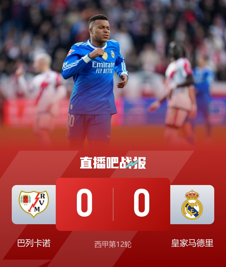 西甲联赛第12轮,巴列卡诺0-0战平皇马,拆伙皇马4连胜。