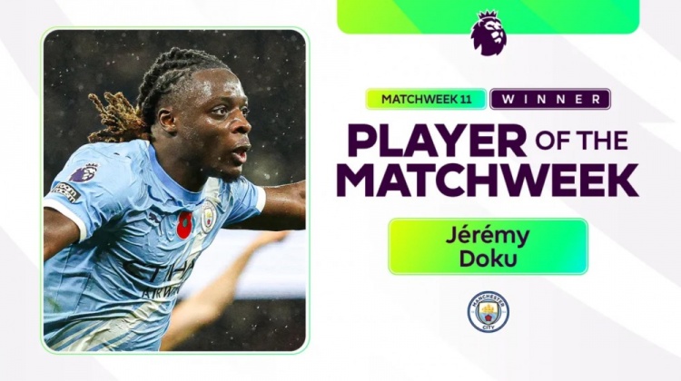 11月11日讯 英超官方音问,经投票曼城边锋多库当选本轮最好球员。